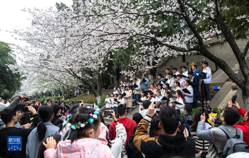 3月18日,武漢大學海燕合唱團在賞櫻現場演唱歌曲。