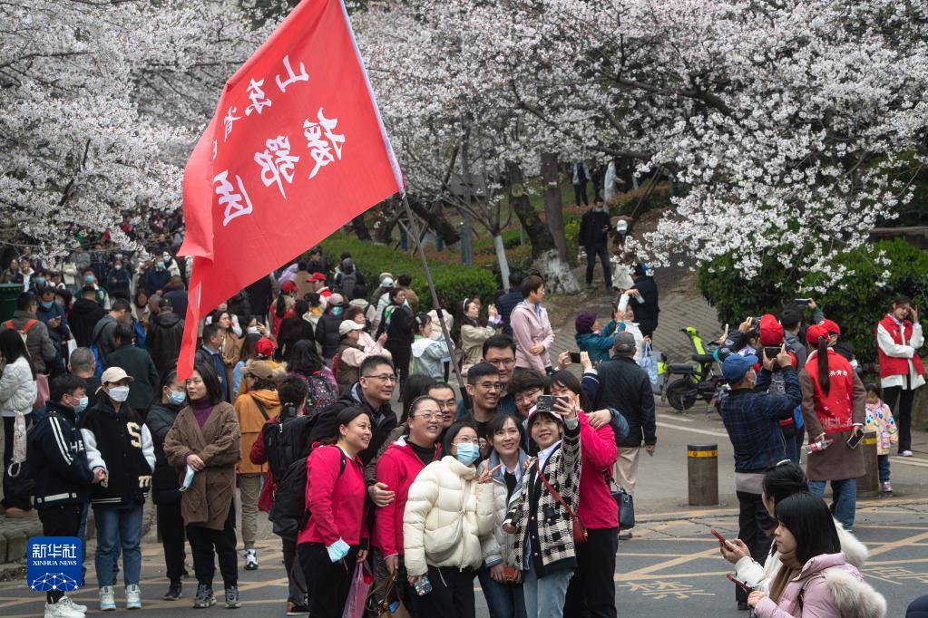 當日,武漢大學舉行抗疫醫護賞櫻專場。珞珈山下,來自全國各地的1.6萬余名抗疫醫護人員及家屬赴約賞櫻。