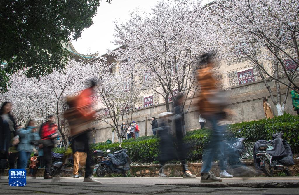 當日,武漢大學舉行抗疫醫護賞櫻專場。珞珈山下,來自全國各地的1.6萬余名抗疫醫護人員及家屬赴約賞櫻。
