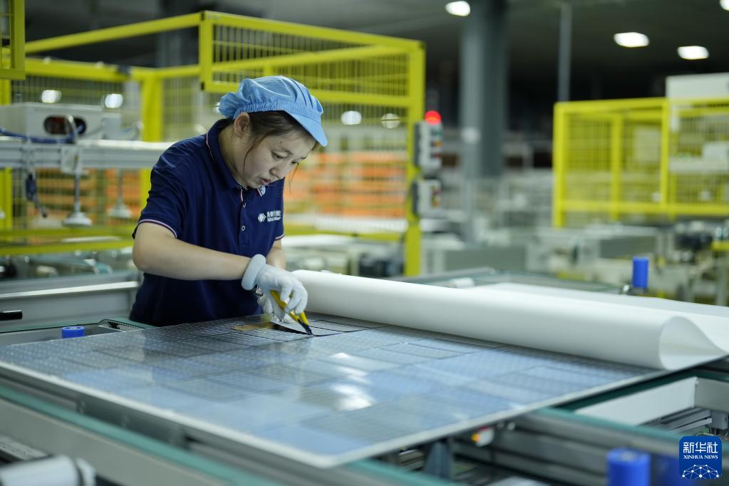 3月18日,河北省玉田縣一家光伏設備生產企業的工人在車間內工作。