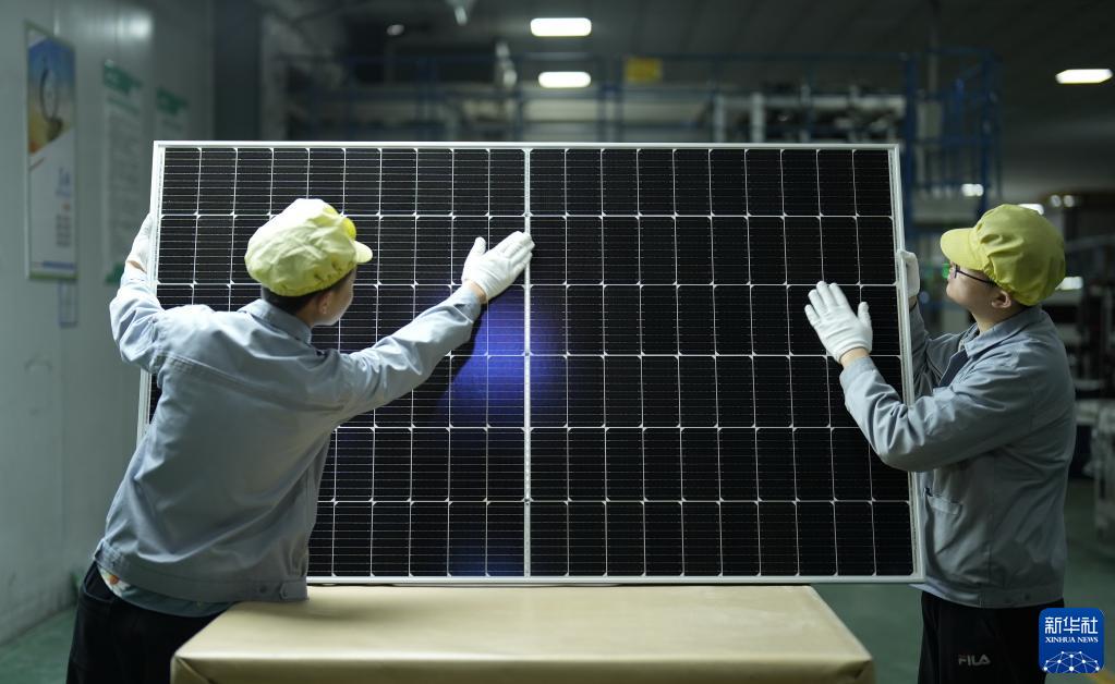 3月18日,河北省玉田縣一家光伏設備生產企業的工人在檢查光伏板質量。