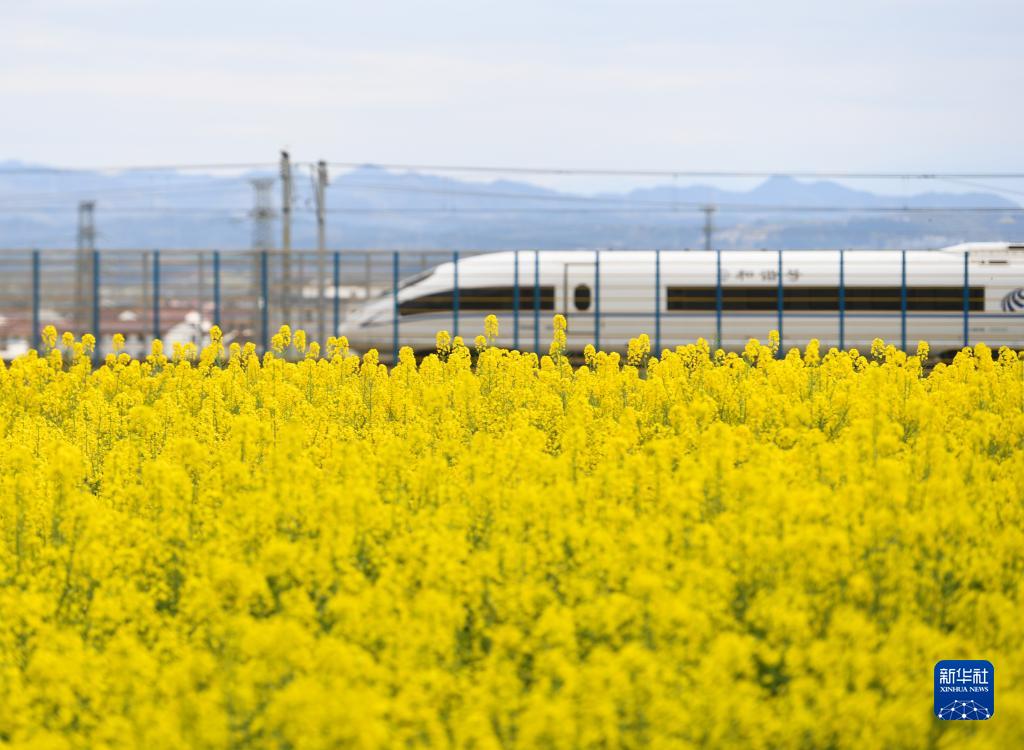 高鐵列車駛過漢中市洋縣洋州街道的油菜花海(3月17日攝)。