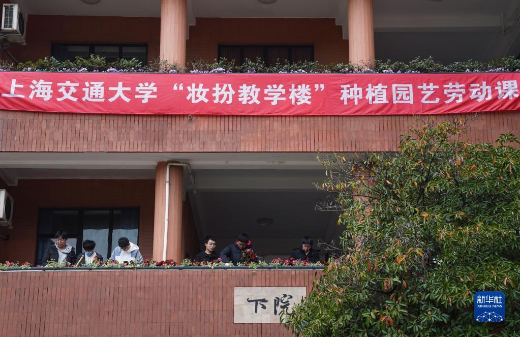 3月18日,在上海交通大學的種植園藝勞動課上,學生在教學樓走廊邊的種植盆內栽種花草。