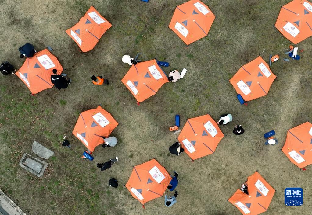 3月18日,在上海交通大學的野外生存勞動課上,學生們在校園大草坪上的“駐扎點”快速扎好帳篷(無人機照片)。