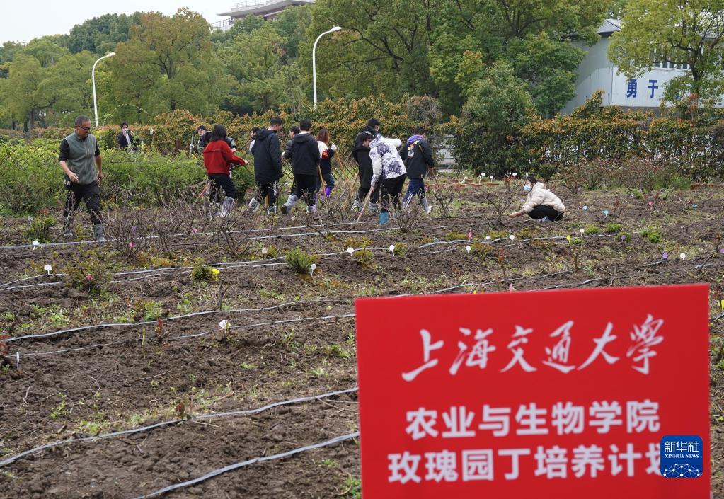 3月18日,上海交通大學的學生在老師的指導下學習玫瑰栽培養護。
