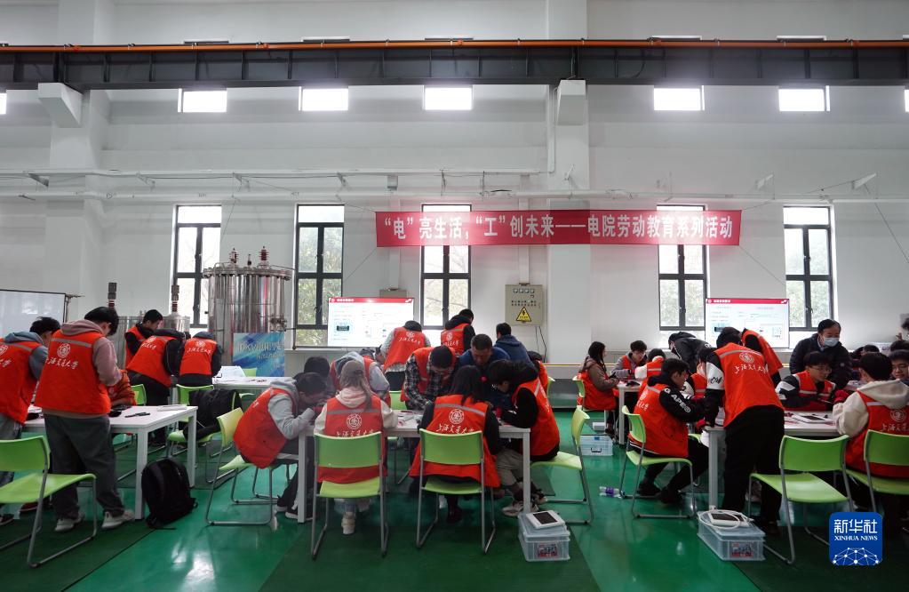 3月18日,在上海交通大學閔行校區的智能電網大樓,學生在學習組裝智能配電箱。
