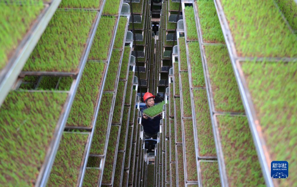 3月18日,湖南省衡陽市衡山縣白果鎮棠興村智能化育秧基地,村民在查看秧苗生長情況。