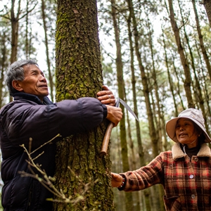 3月12日,護林員王石貴與妻子一起在山林間查看樹木生長情況。