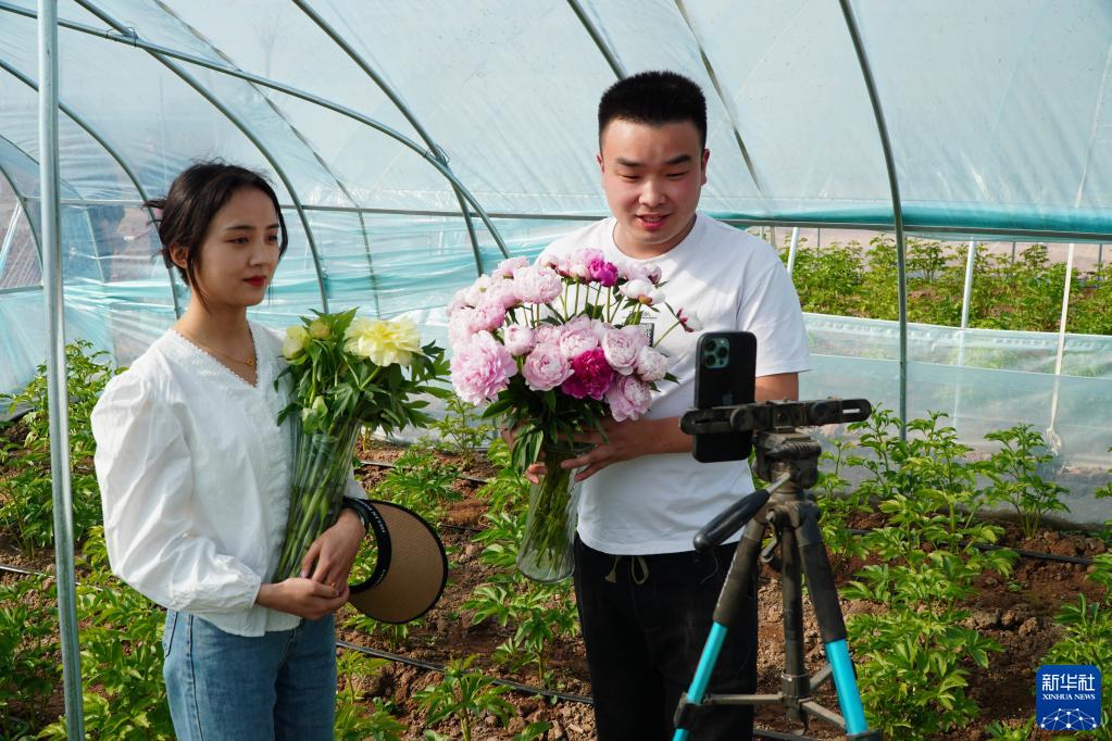 3月14日,在山東省菏澤市牡丹區黃堽鎮,兩名銷售芍藥鮮切花的電商主播在芍藥種植大棚內進行網絡直播銷售。