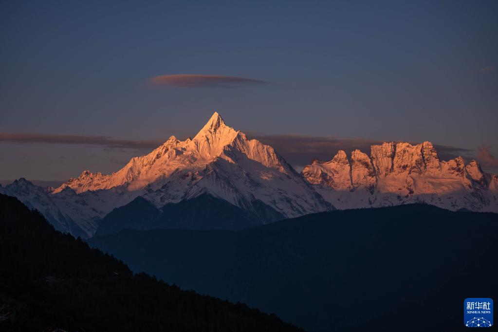 3月10日日出時分拍攝的梅里雪山,皚皚雪峰在金色晨光映照下如披金紗。梅里雪山位于云南省迪慶藏族自治州德欽縣與西藏自治區林芝市察隅縣交界處,是世界自然遺產“三江并流”的主要景觀之一。