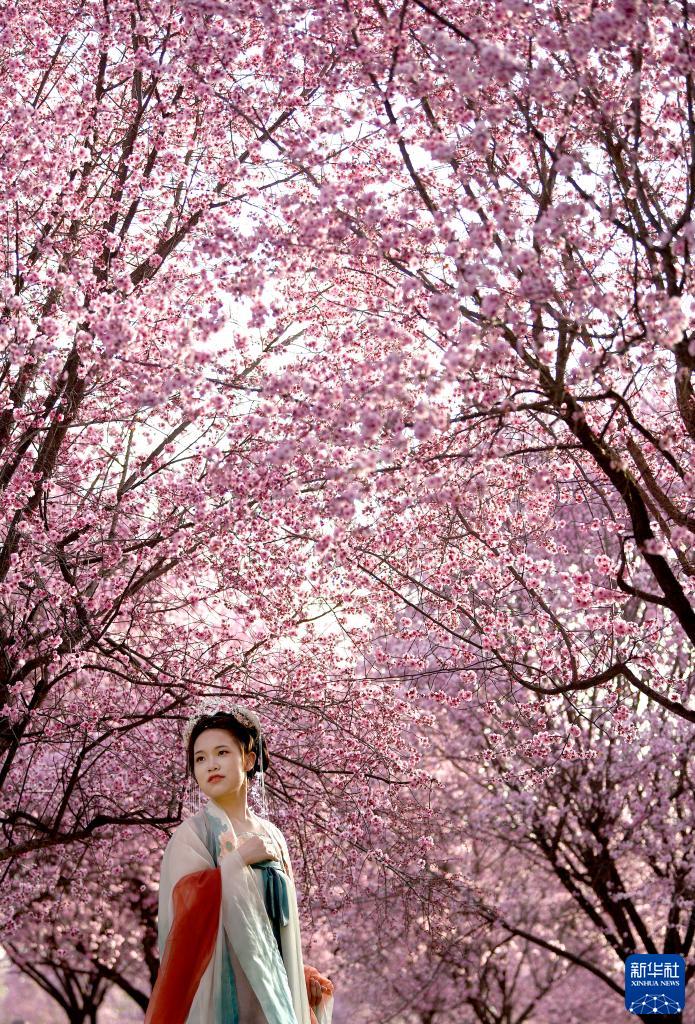 3月14日,古風愛好者在西安大明宮國家遺址公園內賞花留影。