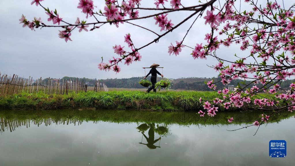 3月18日,在常寧市勝橋鎮泉峰冠村,村民挑運農作物從池塘邊走過。