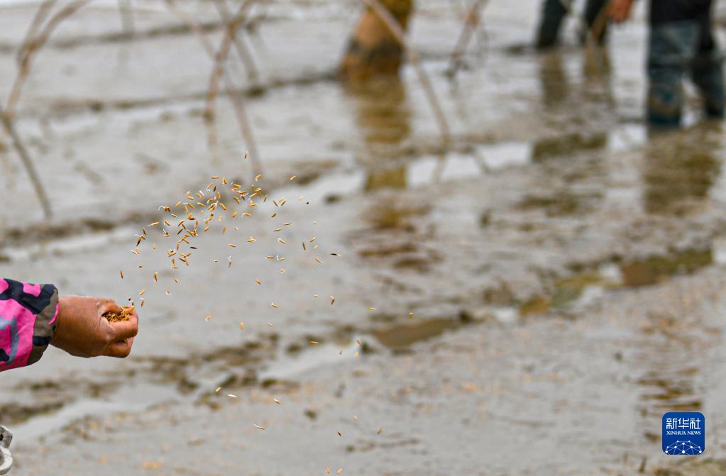 3月18日,在常寧市三角塘鎮長江村,村民播種早稻。