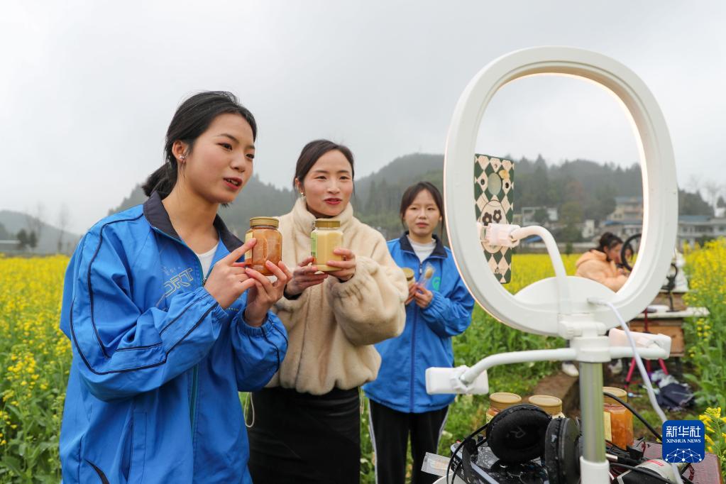 3月18日,岑鞏縣中等職業技術學校電子商務專業的學生在油菜花地里學習直播銷售蜂蜜。