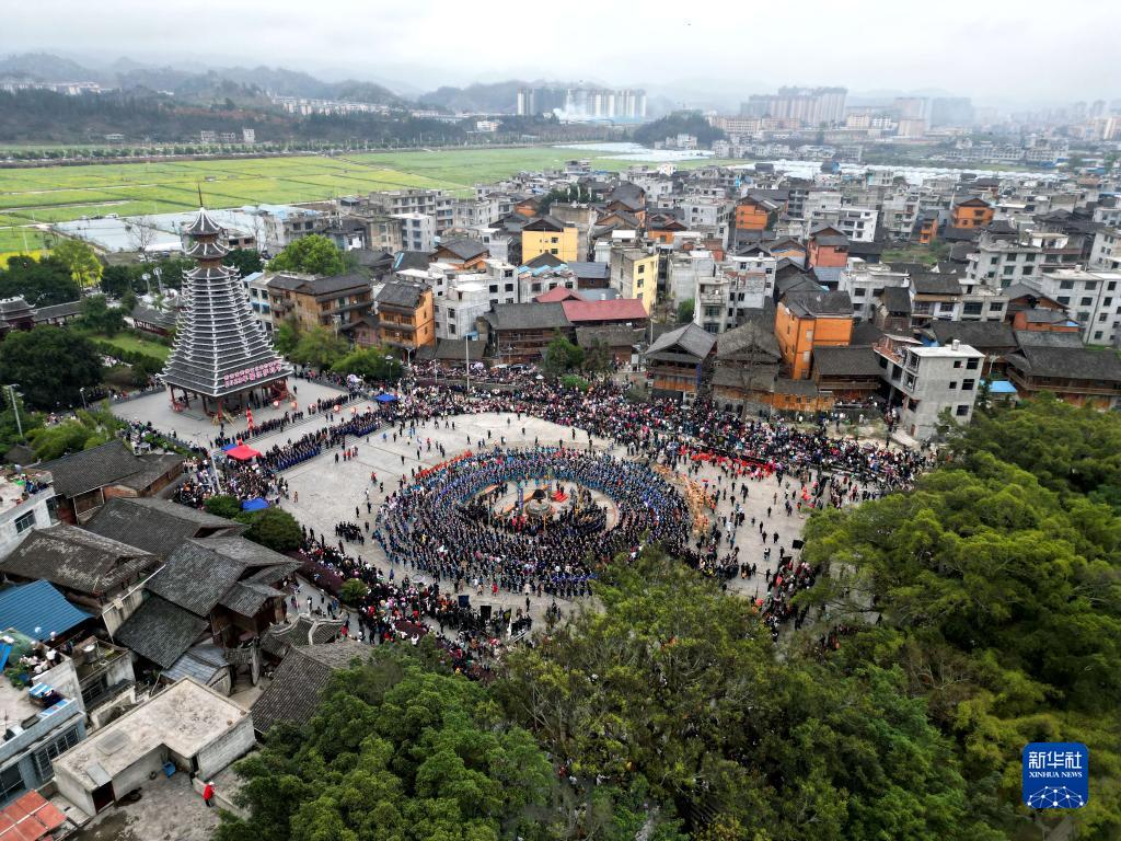 3月18日,榕江縣侗族同胞在歡慶“薩瑪節”(無人機照片)。