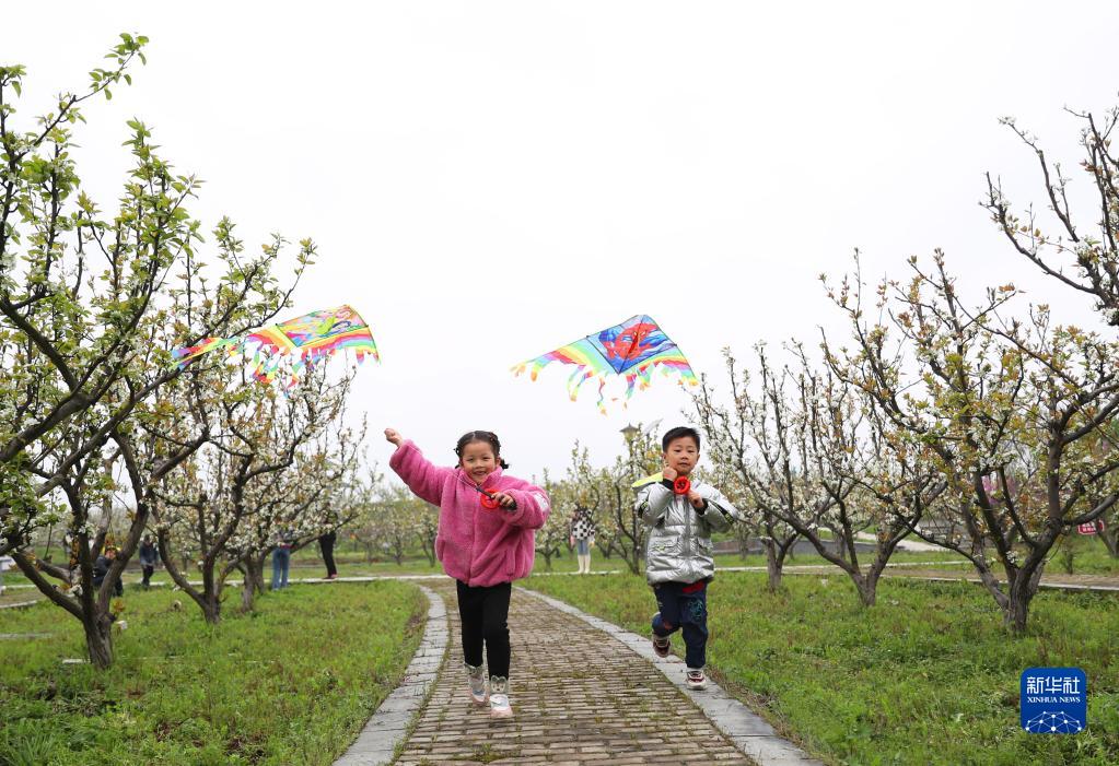 3月18日,在湖南省衡陽市珠暉區茶山坳鎮金甲梨園,兩位小朋友在放風箏。
