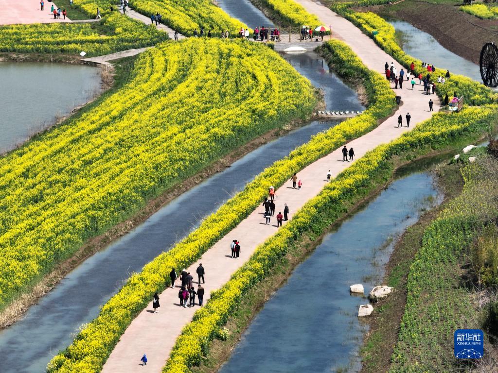 3月18日,游客在江蘇揚州高郵湖上花海景區踏青賞花(無人機照片)。