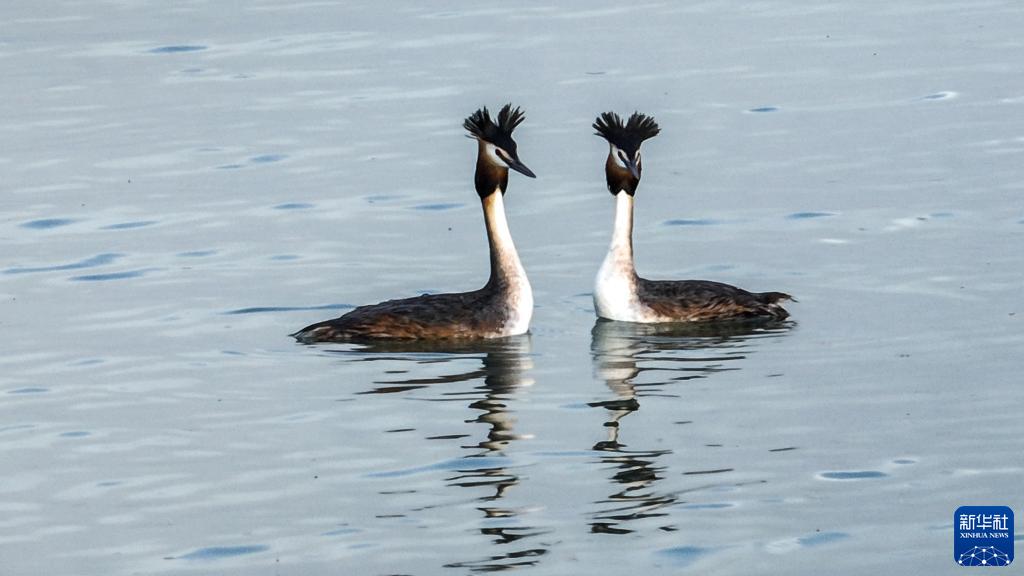 兩只鳳頭??在新疆博斯騰湖畔休憩(3月17日攝,無人機照片)。
