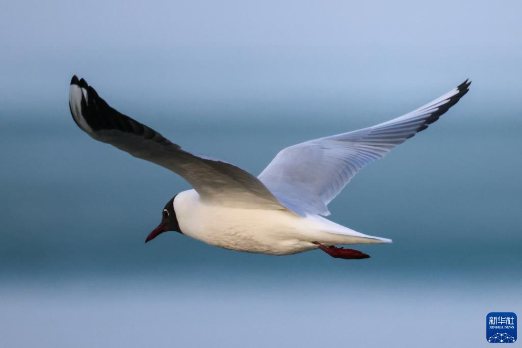 一只紅嘴鷗在新疆博斯騰湖上空飛翔(3月18日攝)。