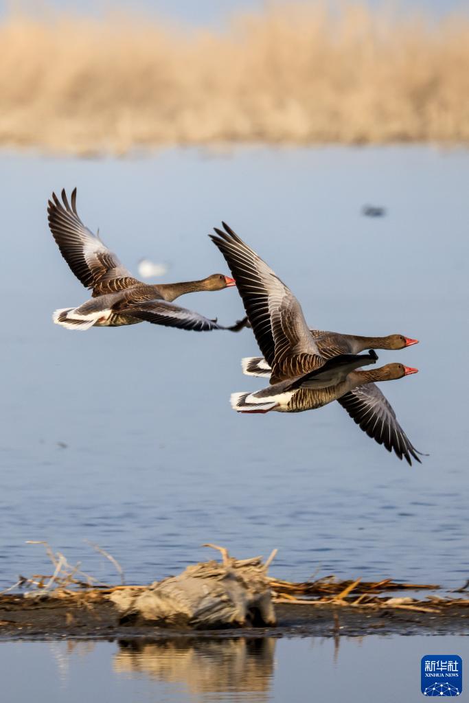 隨著天氣轉暖,冰雪消融的新疆博斯騰湖迎來大批候鳥回歸。