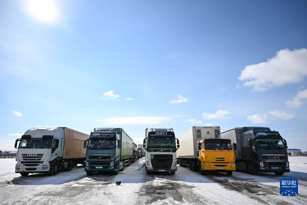 3月15日在滿洲里公路口岸拍攝的等待出境的貨車。