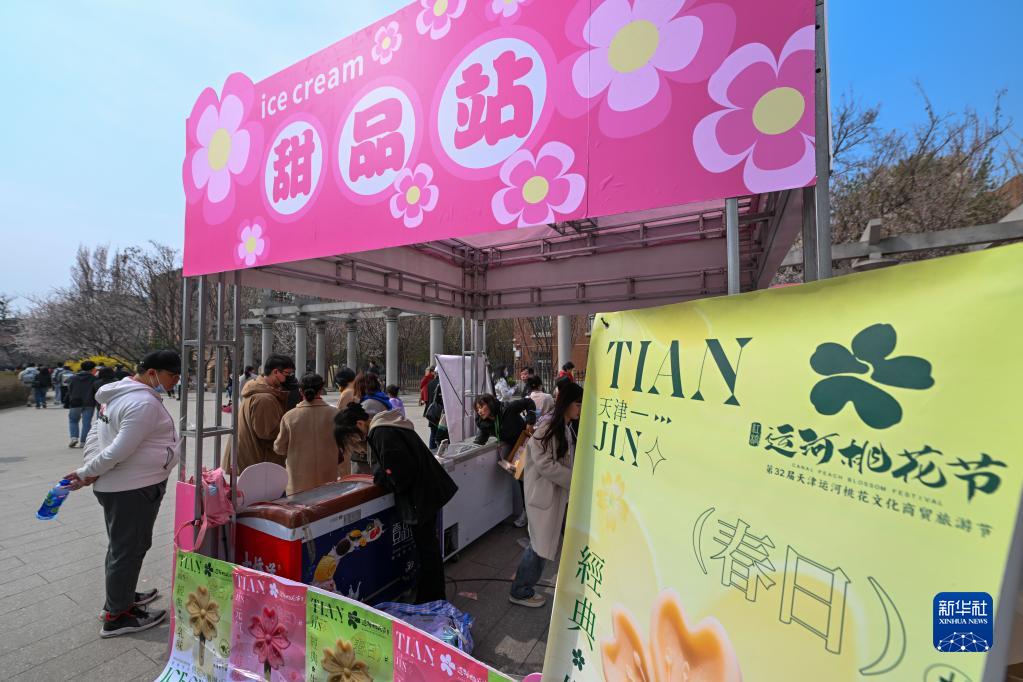 3月19日,游客在天津市紅橋區北運河畔的桃花堤上購買甜品。