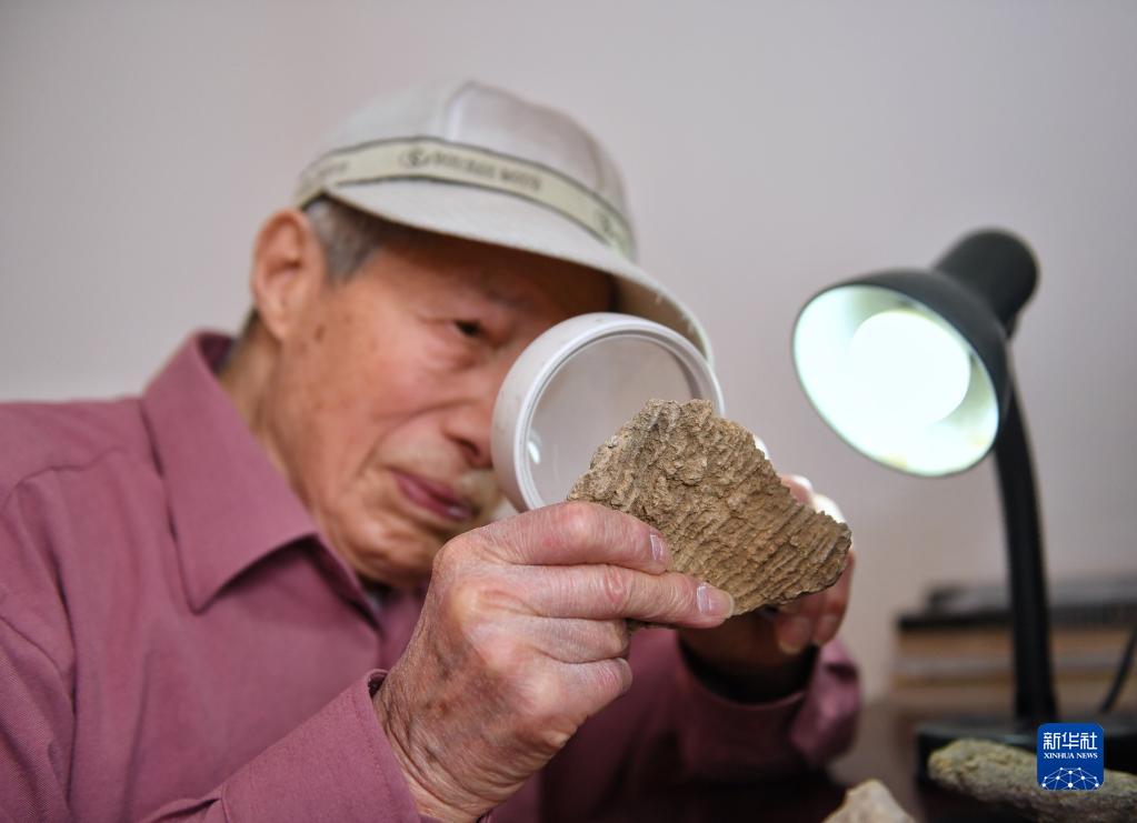 3月7日,吳熙純在位于四川成都的家中觀察一塊三疊紀硅質海綿化石殘片。