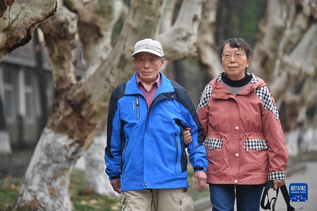 吳熙純與愛人李培華走在成都理工大學校園內(2月27日攝)。