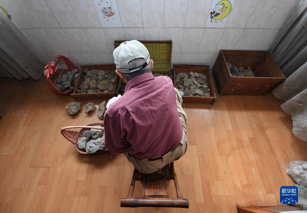 3月7日,吳熙純在位于四川成都的家中整理自己采集的化石。