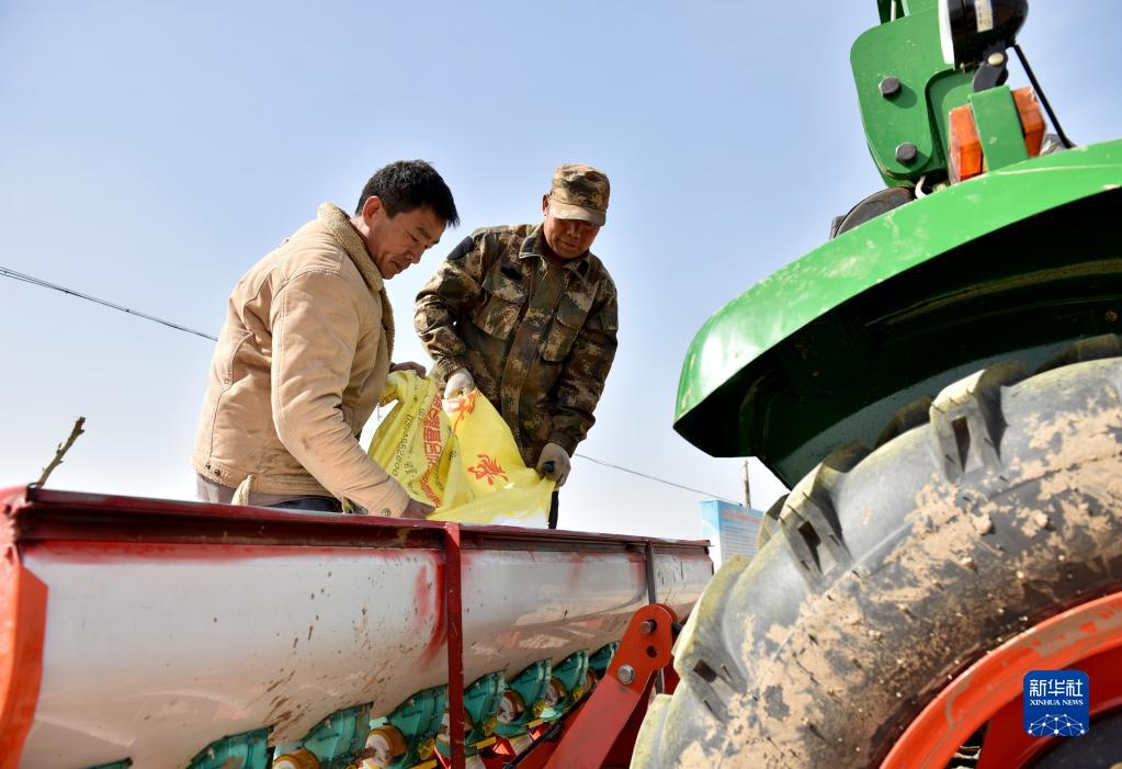 3月19日,河北省邢臺市南和區賈宋鎮寧營村農民在麥田為農機添加肥料。