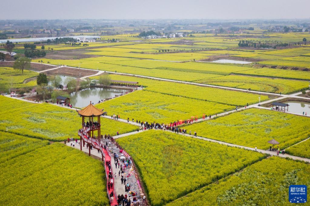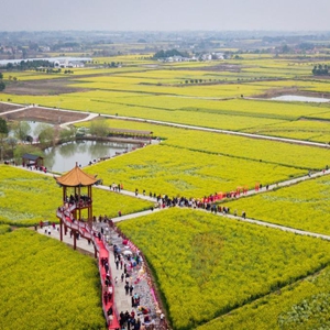 湖北省沙洋縣常年種植油菜面積70余萬畝,當地油菜花海深受游客喜愛。2023年3月以來,在沙洋縣油菜花節核心景區曾集鎮張池村等地,游客成群結隊,在金黃色的田野中徜徉,感受美好春光。