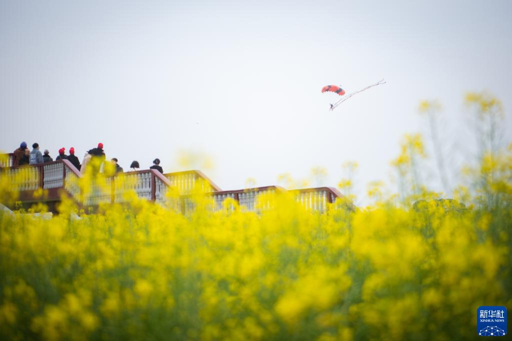 3月18日,游客在油菜花節核心景區觀看跳傘表演。