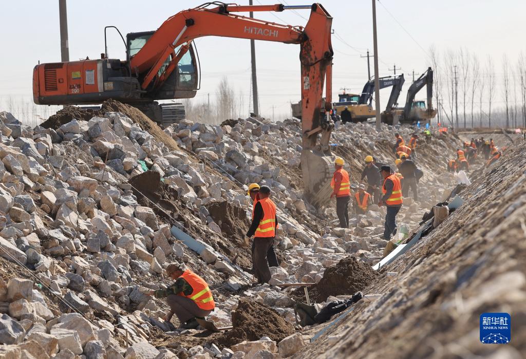 3月19日,工人在唐山市豐南區西葛鎮東尖坨一村高標準農田灌溉水渠改造工地施工。