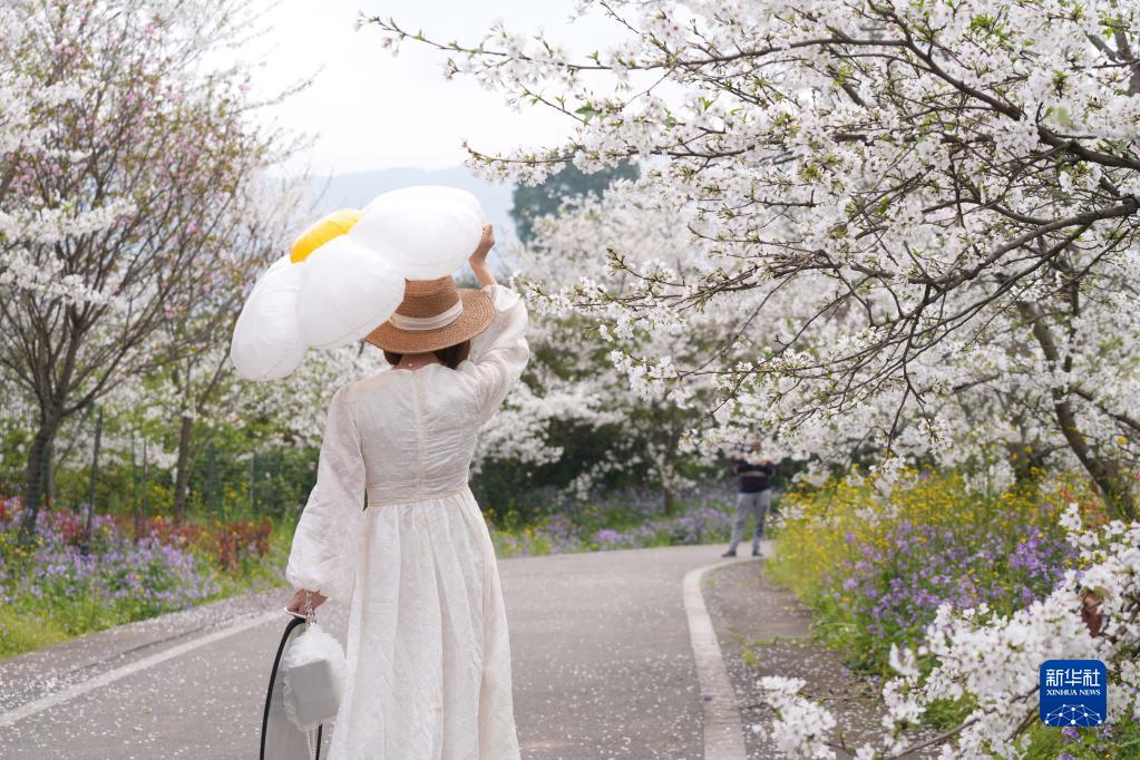 3月19日,游人在重慶市北碚區澄江鎮五一村“櫻花橘香”農業公園觀賞櫻花。