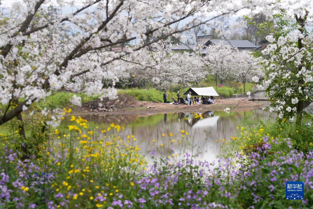 3月19日,游人在重慶市北碚區澄江鎮五一村“櫻花橘香”農業公園的櫻花樹下露營游玩。