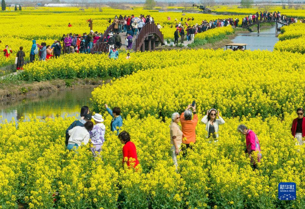近日,江蘇興化千垛菜花風景區溝河交錯圍成的垛田上,油菜花次第開放,吸引人們前來踏青賞花。