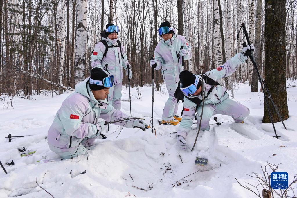 2023年2月7日,松江河森林公安分局雪上巡邏案件偵查大隊許重陽(前左)與孫希剛(前右)在清除獸夾。