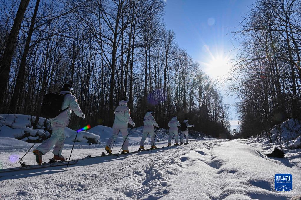 這是2023年2月7日,松江河森林公安分局雪上巡邏案件偵查大隊隊員列隊向巡邏區域進發。