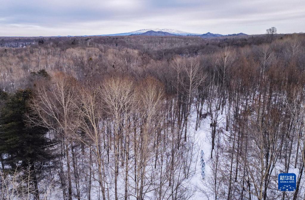 這是2023年2月7日,松江河森林公安分局雪上巡邏案件偵查大隊在林區巡邏,遠處是長白山主峰。