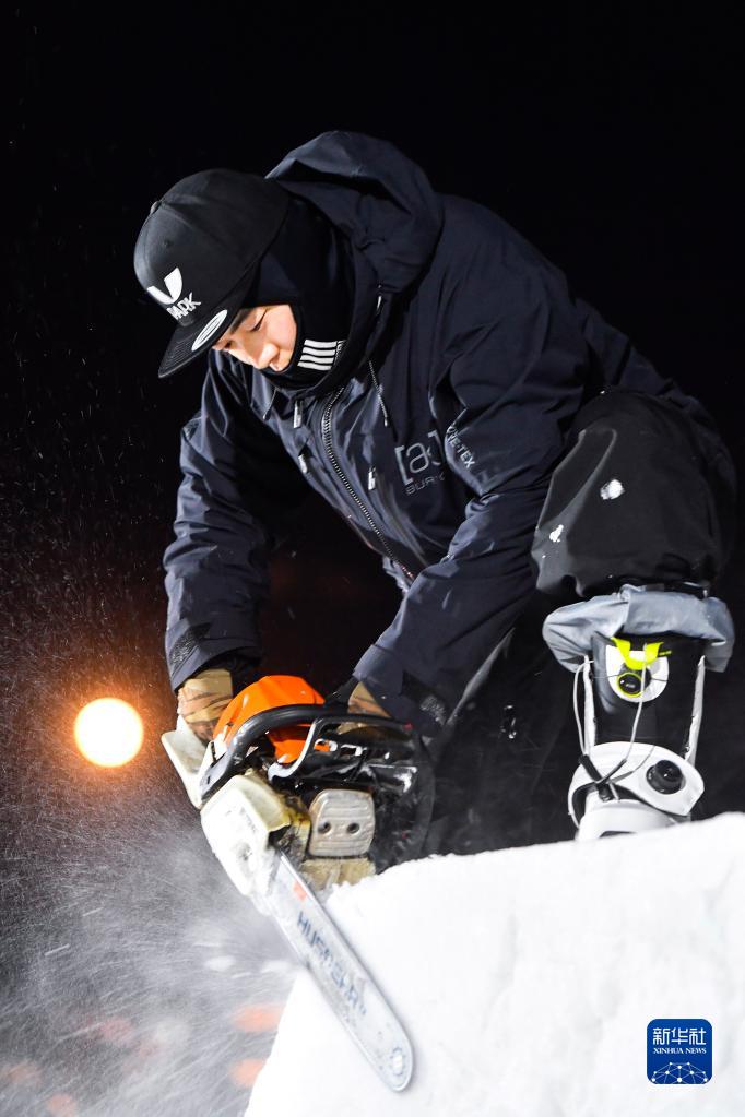 這是2022年12月9日,魏維使用電鋸進行跳臺塑形工作。