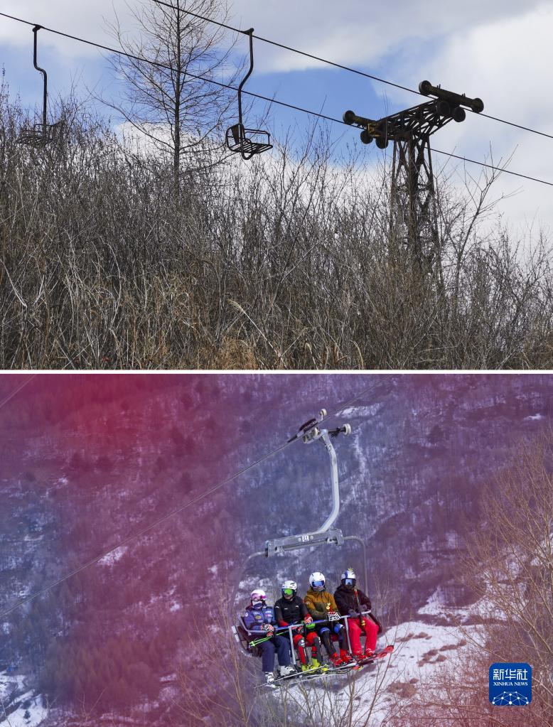 這是一張拼版照片。上圖:這是金廠滑雪場老式纜車的資料圖片;下圖:2023年2月10日,滑雪愛好者在萬峰通化滑雪度假區乘坐纜車(新華社記者顏麟蘊攝)。