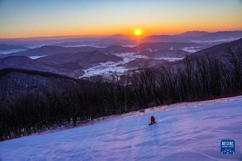 2023年1月1日,在吉林市萬科松花湖度假區,滑雪愛好者在清晨的陽光下滑雪。