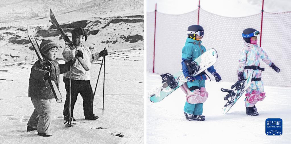 這是一張拼版照片。左圖:1973年2月14日,吉林省通化市5歲的兒童吳小明(左)和于曉紅(右),扛著滑雪板,來到市郊的山上學習滑雪(新華社發);右圖:2023年2月10日,孩子們帶著滑板走在萬峰滑雪場(新華社記者顏麟蘊攝)。