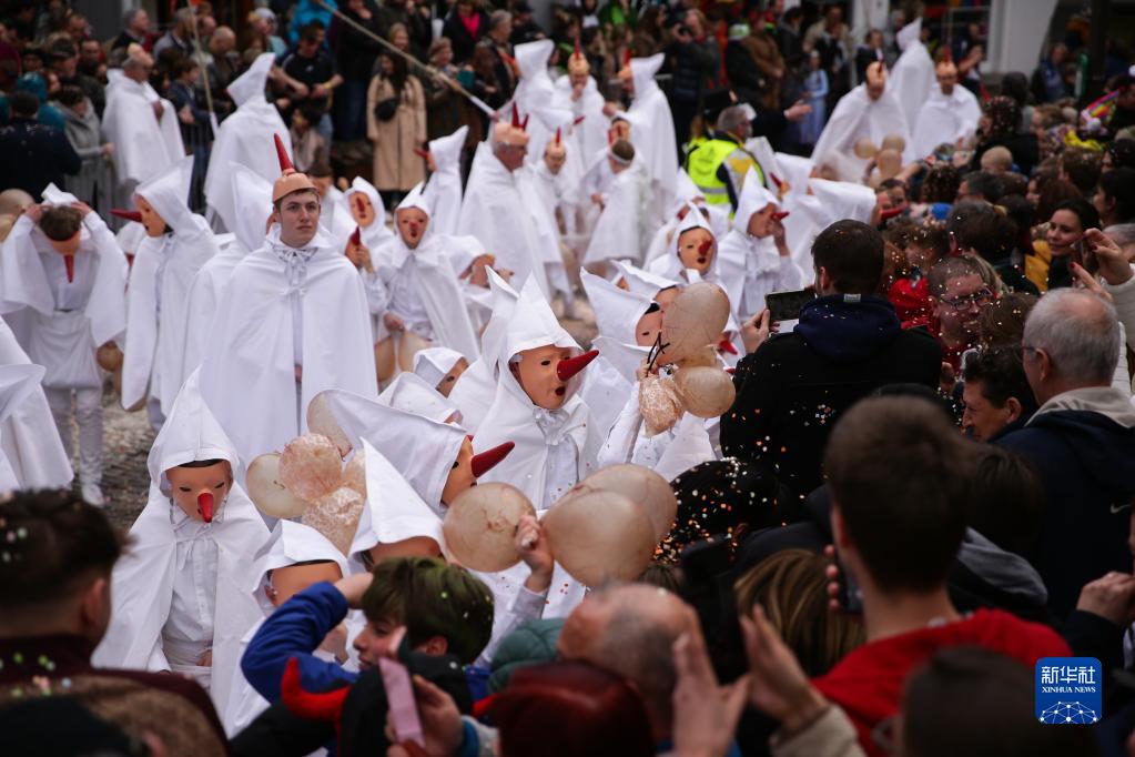 3月19日,在比利時東部的小城斯塔沃洛舉行的狂歡節游行上,裝扮成“白衣人”形象的表演者用吹起的豬膀胱敲打路人的頭。