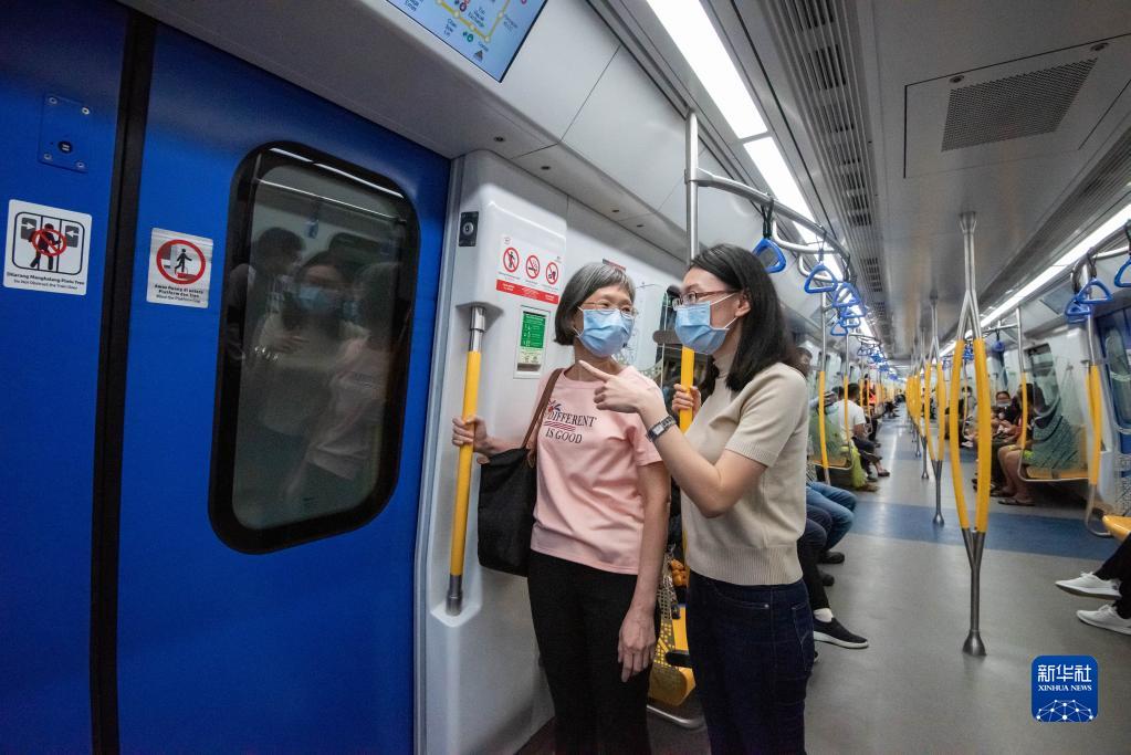 3月16日,在馬來西亞吉隆坡,中國中鐵東方隧道有限公司環境經理朱文映與母親一同乘坐MRT 2線路首發列車。