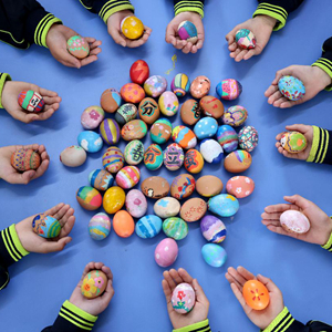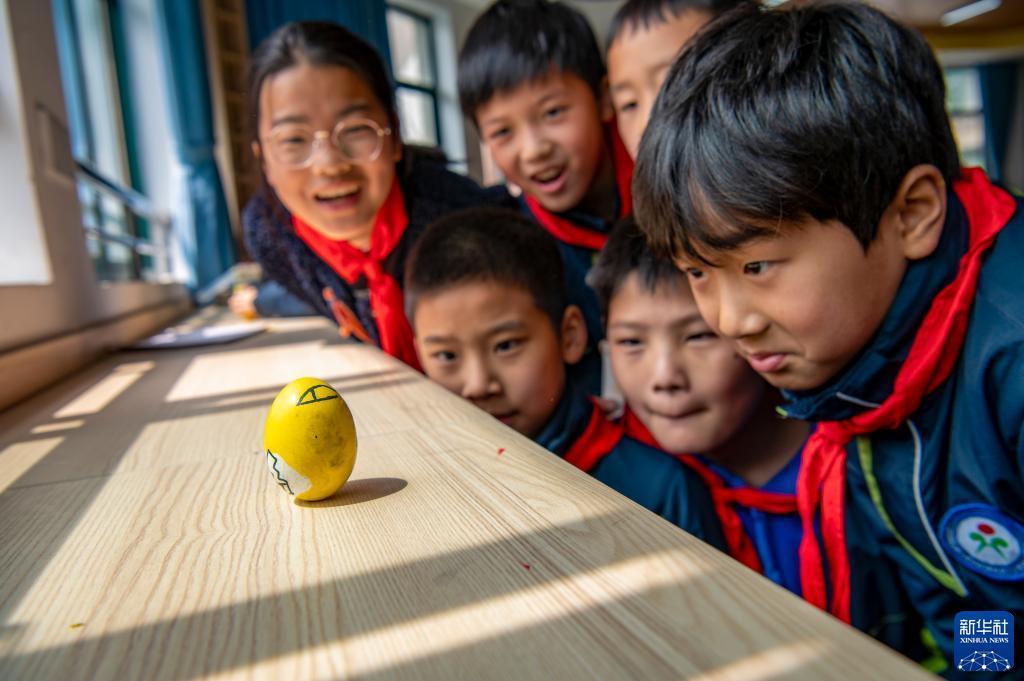 3月20日,在浙江省金華市婺城區紅湖路小學,學生體驗立蛋民俗。