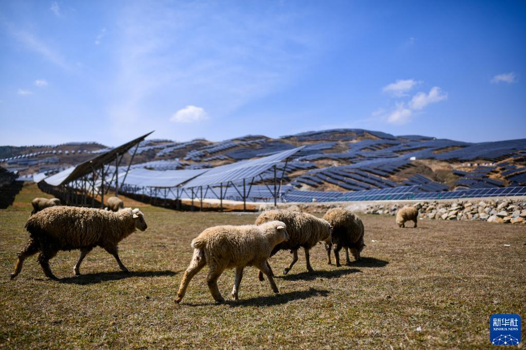 羊群在云南省巧家縣海壩光伏電站吃草(3月19日攝)。