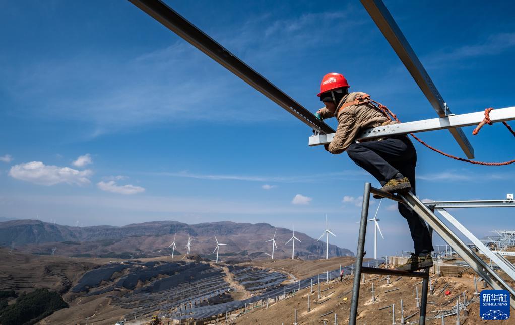 工人蘇天云在安裝光伏發電設備(3月19日攝)。