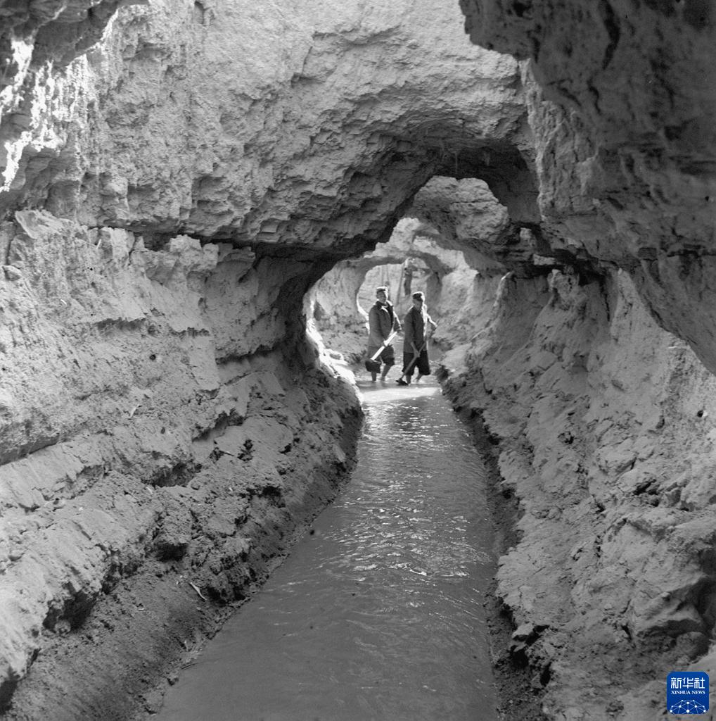 在新疆吐魯番,當地農民正沿著地下渠道檢查水流情況,以保證農田生產用水(1963年5月9日攝)。