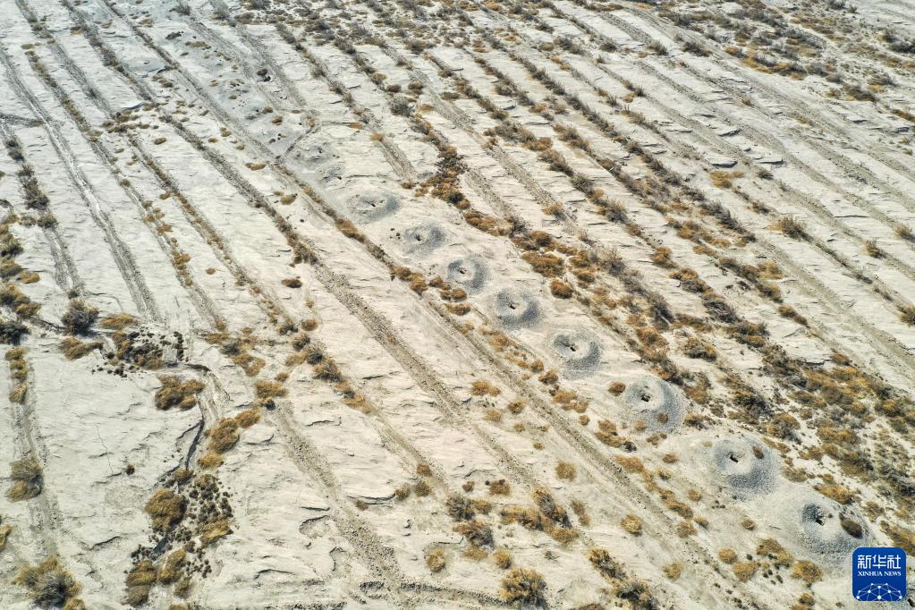 這是在新疆吐魯番市高昌區艾丁湖鎮拍攝的坎兒井豎井口(3月9日攝,無人機照片)。